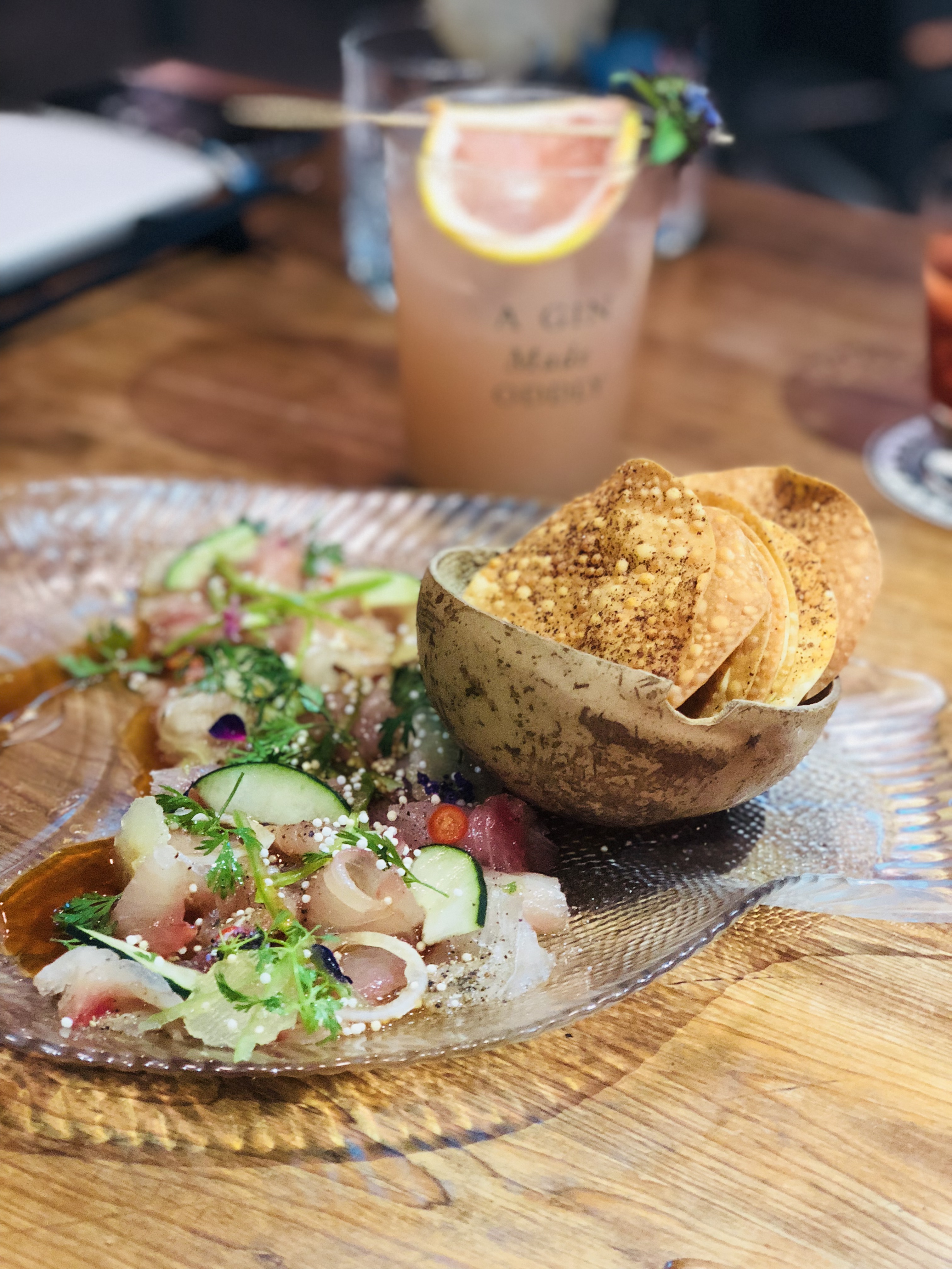 Desde el momento de la llegada, te sientes como en casa con la excepcional decoración del lugar, en donde su luz cálida y sus mesas te invitan a quedarte mientras escuchas los éxitos de las mejores décadas de la música. Su amable personal, en seguida se encarga de ofrecerte algún trago que se adapte perfectamente a tu preferencia en particular. La carta de mixología es amplia y sin duda alguna encontrarás una opción que se vaya de acuerdo con tus gustos. Durante nuestra visita, nosotros optamos por el cóctel Bombay, preparado con toronja, pimienta rosa y esencia de rosas. Debemos decirte que pocos tragos en la CDMX nos han dejado con ganas de regresar al lugar solo para poder probarlos de nuevo, y este es uno de ellos. Refrescante, dulce y deliciosamente aromático.