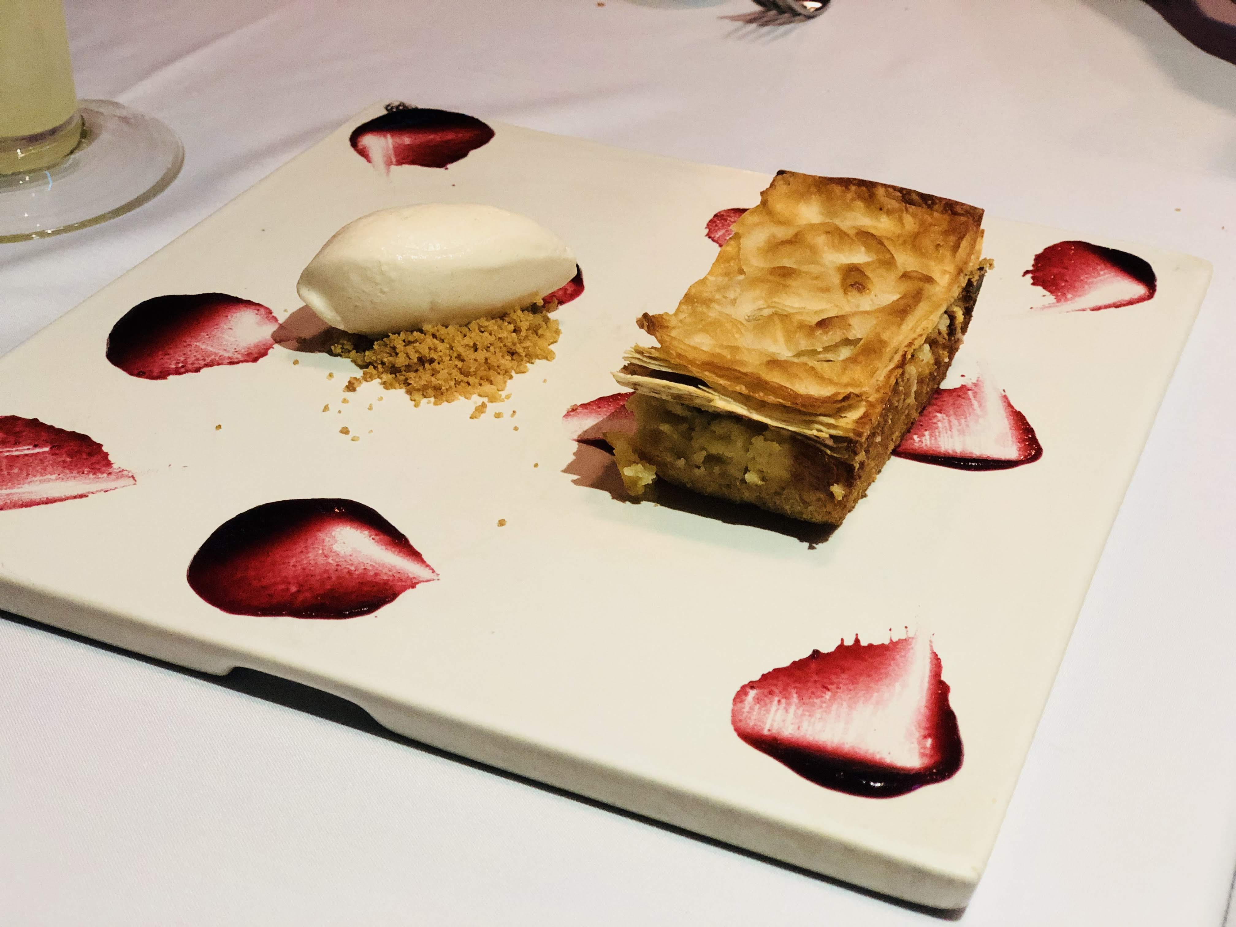 Después de haber limpiado el planto por completo, dimos por finalizada la noche con un espléndido Cheesecake Baklava, preparado con jamaica, romero y helado de rosas. Un postre aromático, en donde el contraste de texturas suaves y crujientes y la temperatura fría del helado, crean la mancuerna perfecta de sabor. Un imperdible durante tu visita.