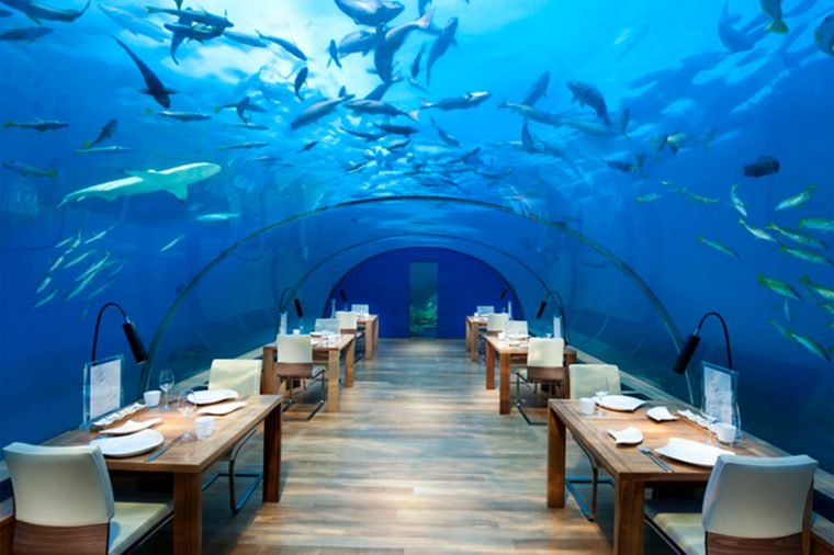 ¿Te imaginas cenar entre tiburones, mantarrayas y cientos de peces? En este restaurante ubicado en las Maldivas, dentro del hotel Conrad, puedes disfrutar de un elegante festín a más de 16 pies por debajo del mar. En esta experiencia submarina limitada a 15 personas tendrás la mejor vista a las maravillas del océano. Las fotos más impactantes garantizadas.