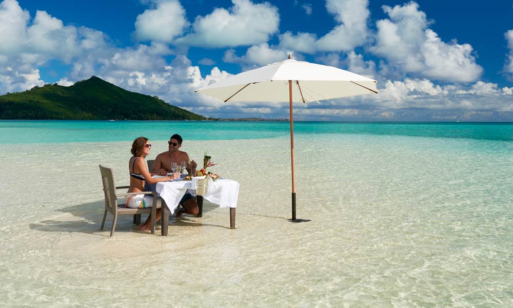 ¿Qué puede ser mejor que estar en las paradisíacas playas de Bora Bora? Comer increíble en ellas. No te limites con cenar a la orilla del mar, cuando puedes estar dentro de él. Las cristalinas aguas de esta isla son un espacio perfecto para pasar unas vacaciones inolvidables y poder disfrutar de un buen rato, ya que sus aguas son muy tranquilas, tanto que puedes tomar una copa de champagne en ellas.
