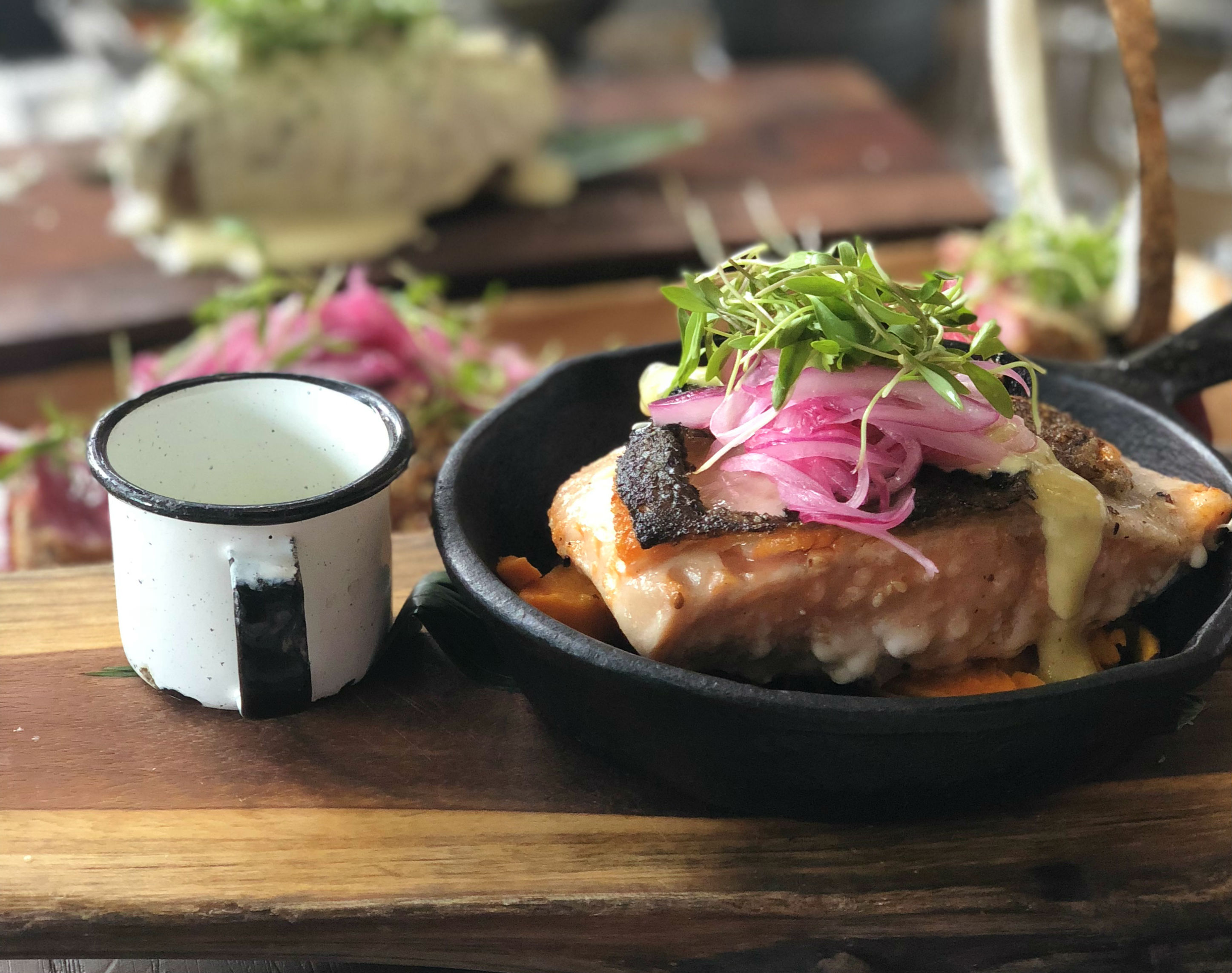 Este restaurante ubicado en una de las avenidas más importantes y representativas de Polanco se caracteriza por su oferta culinaria que pone énfasis en los platillos a las brasas. Por esta razón en su menú no podía faltar un rico salmón a la parrilla con salsa de ajo y crujiente de poro con aroma cítrico. Te dejará sin palabras.
