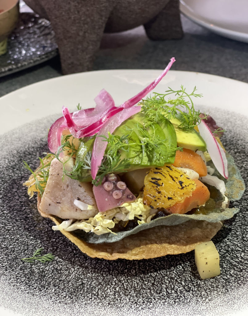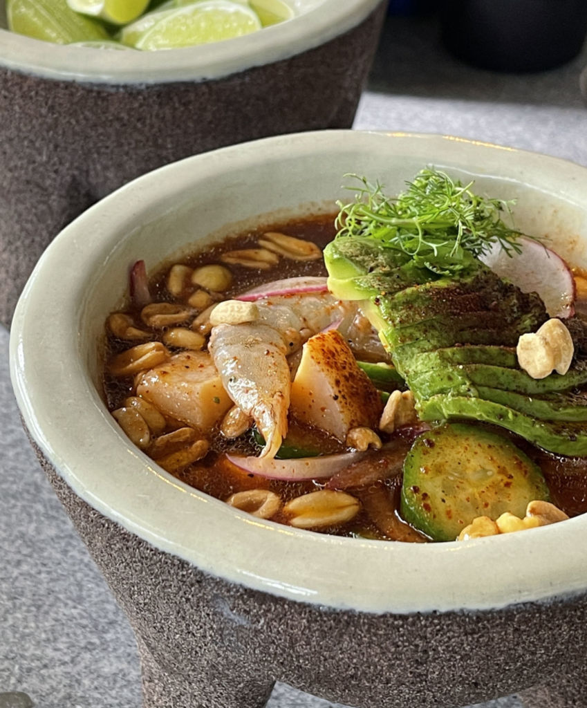 En la parte de mixología, la barra es la que recibe al comensal con tragos llenos de color gracias a su inspiración local y el uso de técnicas ancestrales como el tatemado de hoja de maíz, las frutas de temporada y los dulces típicos. Además de su extensa carta de vinos mexicanos, destilados, licores y por supuesto mezcal oaxaqueño y poblano. Un secreto de este lugar es que cuenta con un speakeasy de Jazz y Blues.