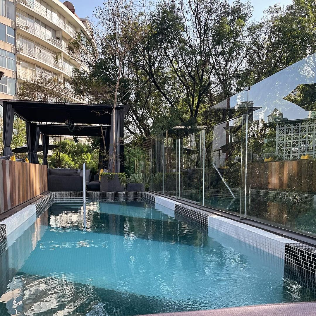 Puedes subir al rooftop por el elevador, pero te recomendamos tomar las escaleras, pues esta estructura helicoidal presenta unas vistas francamente espectaculares del edificio (ten la cámara preparada porque con cada escalón se revela un ángulo nuevo lleno de posibilidades). Una vez arriba, lo que nos atañe son las vistas frescas y rodeadas de árboles de Polanquito y, por supuesto, la alberca. Además de la barra, hay un par de cabanas con salitas muy cómodas para pasar la tarde que se pueden rentar para celebrar ocasiones especiales en petit comité.