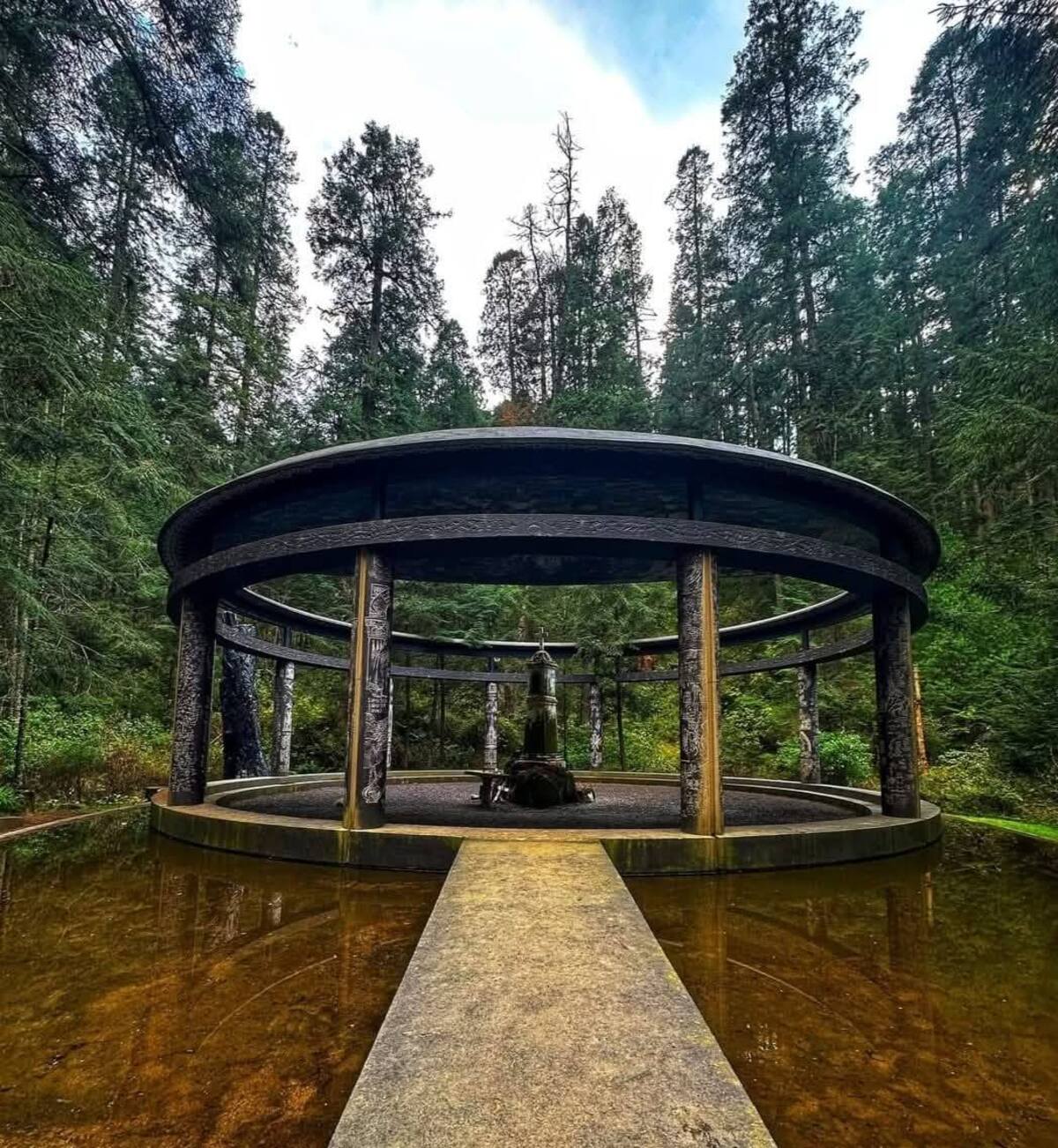 Como podrás imaginar, el santuario está lleno de simbolismo. Cuenta con un domo de media luna que representa a la Virgen de los Remedios, un anillo que simboliza la Corona del Divino Rostro y doce columnas, cada una representa un lugar sagrado a donde los devotos acuden a pedir salud y fertilidad. En la base de estas columnas, corren canaletas que guían el agua hacia espejos de cristal, una alusión a las deidades acuáticas como La Tlanchana de Metepec. Otra de las características más notables es un mural del artista Mauricio Tello, que rinde homenaje a los guardianes del bosque y a los hongos que crecen en la zona, reforzando la conexión entre la naturaleza y la fe. Y al centro hay un pequeño altar donde los devotos dejan flores y hacen sus oraciones.