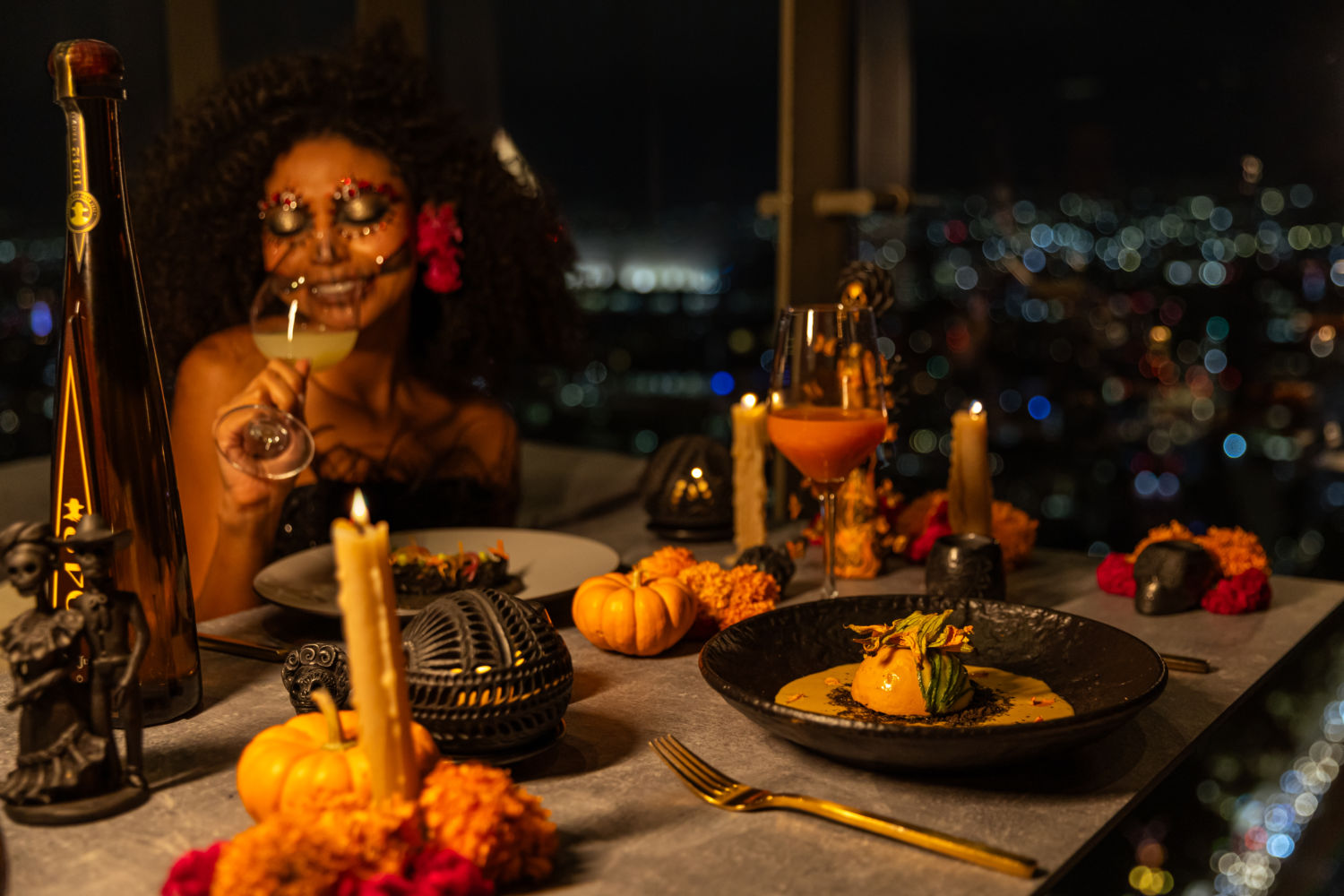 Otra de las experiencias que no te debes perder es la Cena Negra by Don Julio. Esta se llevará a cabo el 1 y 2 de noviembre en Cityzen Rooftop Bar. A través de un menú sensorial disfrutarás de exquisitos platillos. La velada comienza con el Sketch de la vida, una esfera de calabaza con cenizas de totomoxtle y pétalos de cempasúchil. Le sigue el Drapeo del viento, una lobina envuelta en un velo de tinta de calamar. Continúa el Bordado de montañas, un taco de short rib, cubierto de mole negro y adornado con flores de frijol. Luego el Desfile final, una pavlova de cempasúchil y oro comestible.