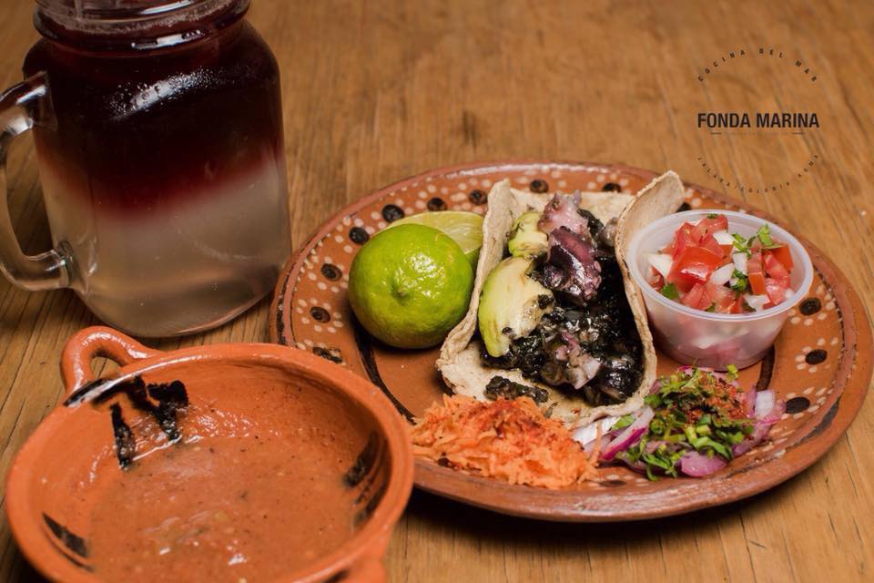 Fonda Marina es una cervecería y cocina de mar que ofrece típicos y deliciosos sabores de barrio. Con originales tostadas, rebosantes tacos, cócteles, una variedad de salsas picositas y auténticos platillos de mar, este restaurante presume de un completo y variado menú que saciará cualquier gusto. Si lo que quieres es un buen pulpo, pide su taquito de tinto negro con pulpo y calamar, o bien una orden de tacos con pulpo a las brasas. Te encantarán.