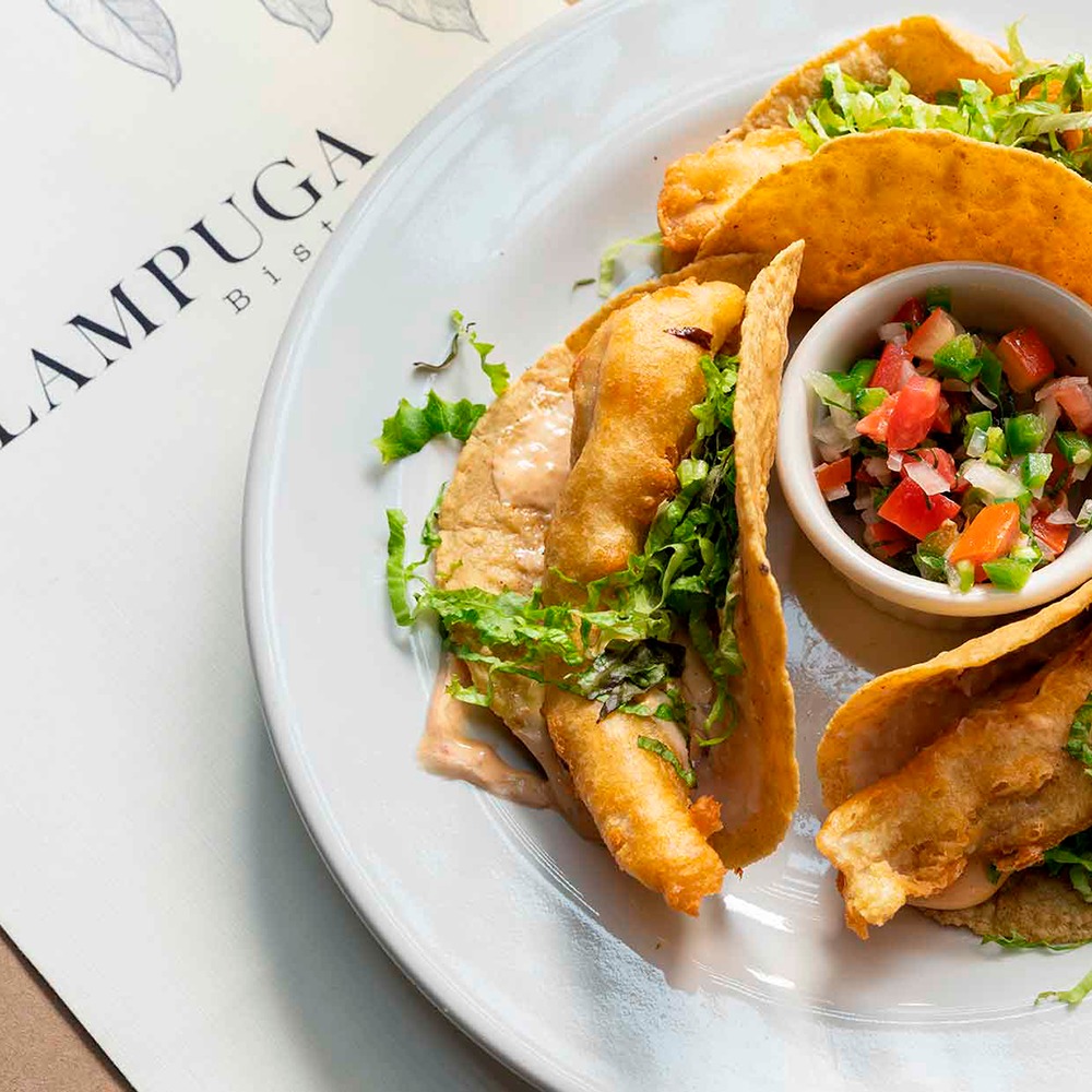 En Lampuga encontrarás una carta de mariscos para toda la familia, siempre con la mejor atención e instalaciones impecables. Para el plato fuerte, tienes que ordenar los tacos de pescado estilo Baja California, con opción a pescado o camarón capeado. Si tienes ganas de transportarte hasta el Reino Unido, sus Fish & Chips son una crujiente delicia.