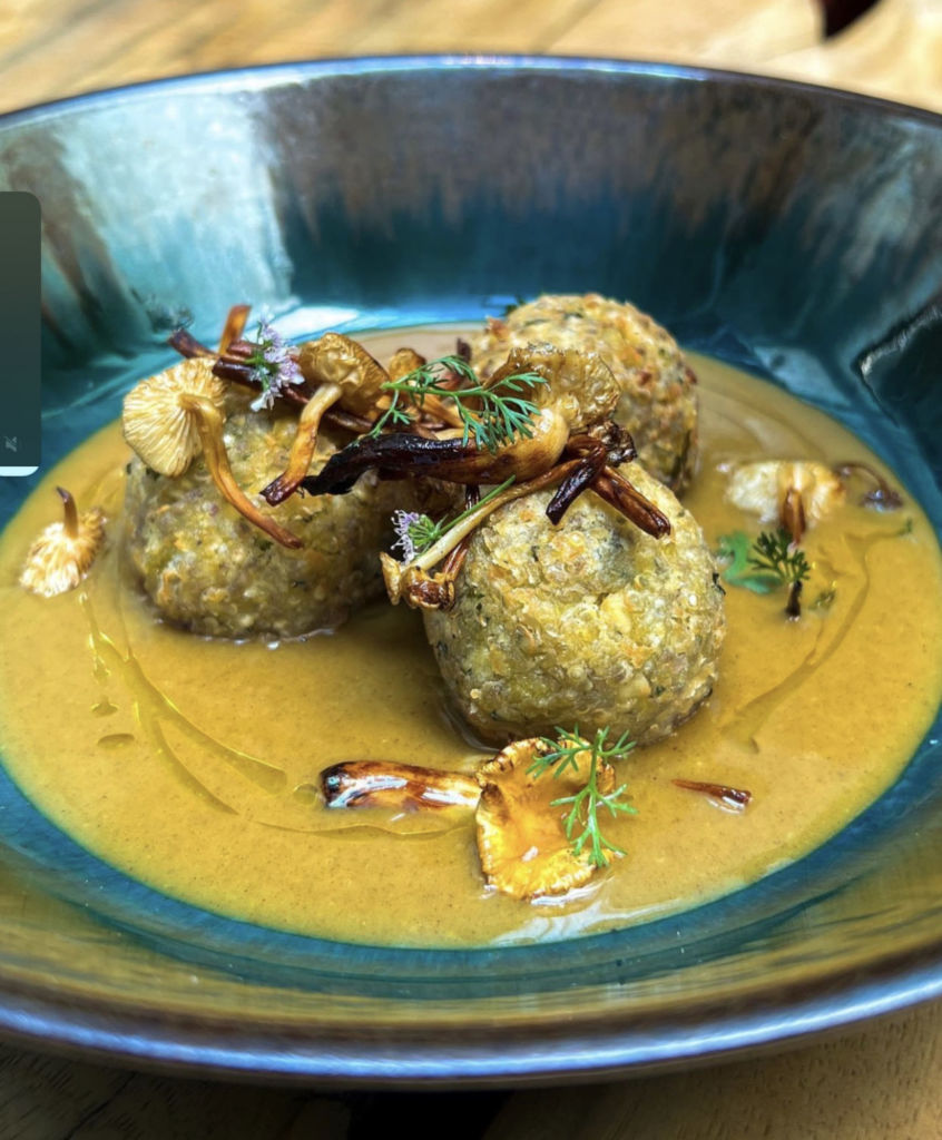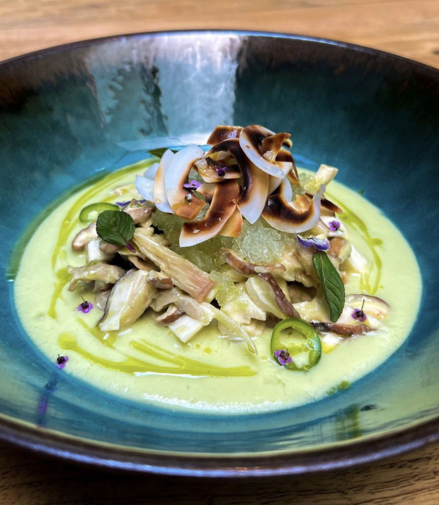En su menú puedes encontrar mazorca de huitlacoche con salsa molcajeteada y tortillas a mano, gnocchetti de hongo trompeta, setas rosas con miso y toronjil, enokitake con garbanzos, plátano macho y curry, cerdo pelón de yucatán con salsa de hongos y frijoles criollos y de postre chocolate, mazapán y polvo de hongos. Sin duda, una experiencia culinaria única en su tipo.