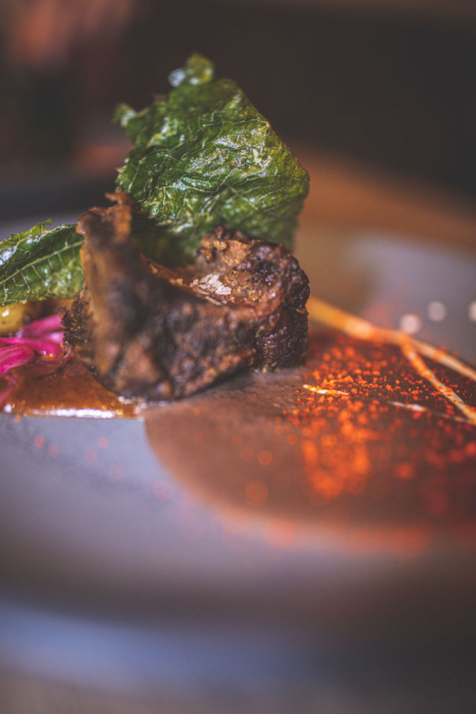 Short rib confitada en dúo de mole con frijol.