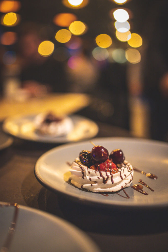 Pavlova con frutos rojos y maracuyá.