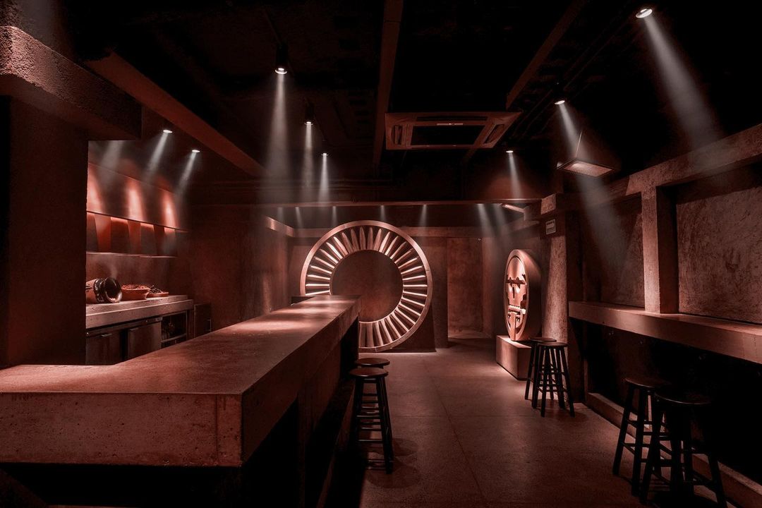 Desde fuera se aprecia apenas un pequeño letrero iluminado con el nombre de Tlecán, pero es cruzando su puerta que se abre entrada a un maravilloso recinto de atmósfera mística y modernista. Éste se trabajó en colaboración con la agencia creativa Anagrama y la firma de diseño de iluminación Lum Lum, expresando espacialmente el elemento del fuego con grandes barras de cemento descubierto, deidades talladas en piedra, decoración arqueológica y luces cálidas que le brindan al lugar un ambiente bastante misterioso.