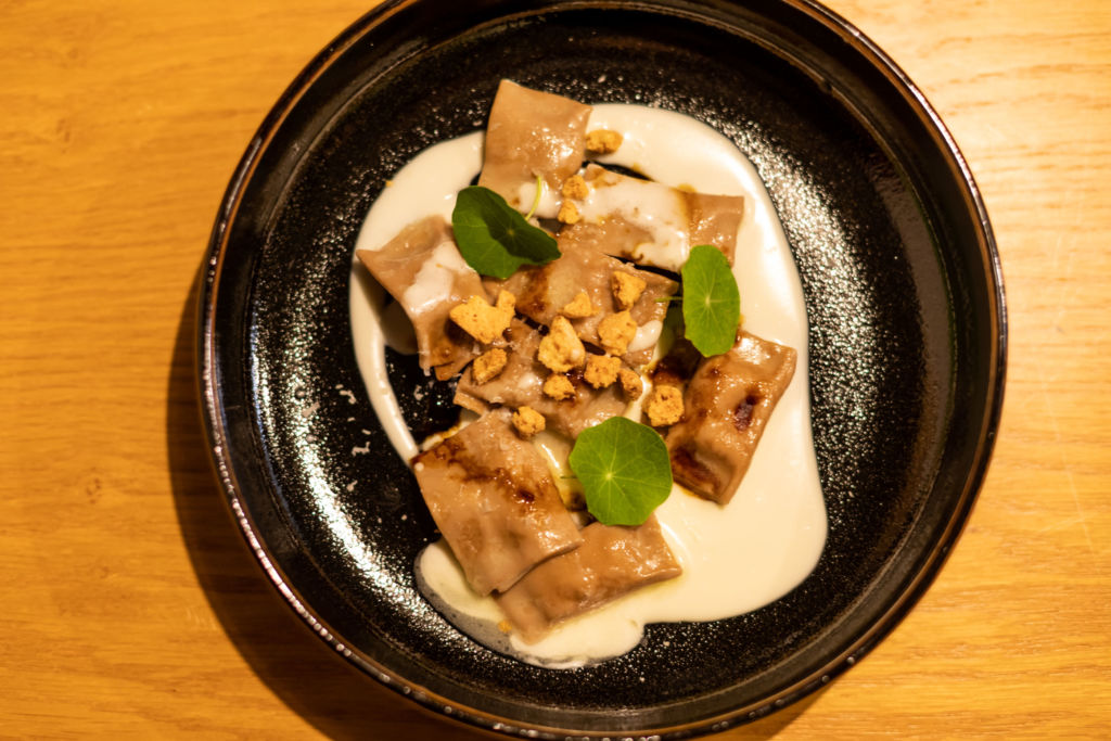 La estrella de la noche fueron los agnolotti (una pasta rellena parecida al raviolo) de camote con salsa de fondue, aceto balsámico de 25 años y amaretti. Es de esos platillos que, si fuese socialmente aceptable, lamerías el plato. En este tiempo se nota la elegancia del menú y las complejas técnicas que utilizan los chefs. El maridaje se hace con Relámpago, un vino mexicano joven del Valle de Guadalupe. Sus notas salinas y su acidez hacen sinergia con la textura cremosa de la pasta.