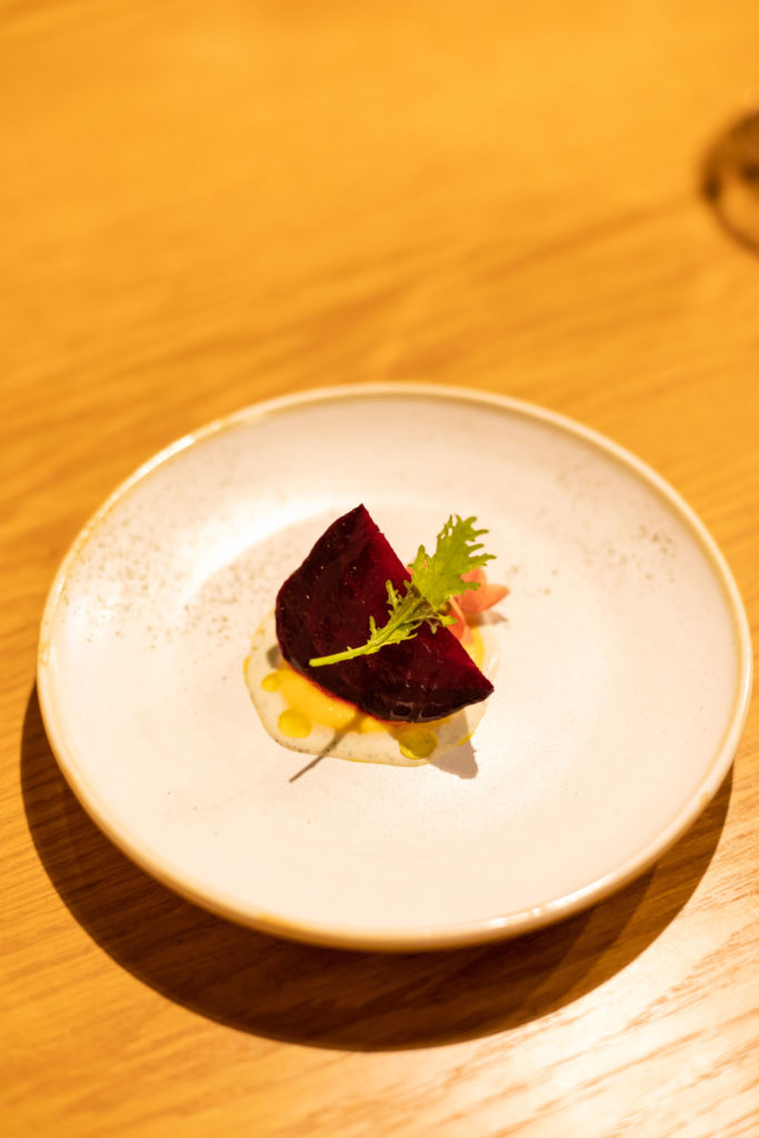Para continuar, un betabel rostizado en costra de sal y cacao fue la agradable sorpresa al paladar. Con un equilibrio de texturas, marida muy bien con el vino dulce.