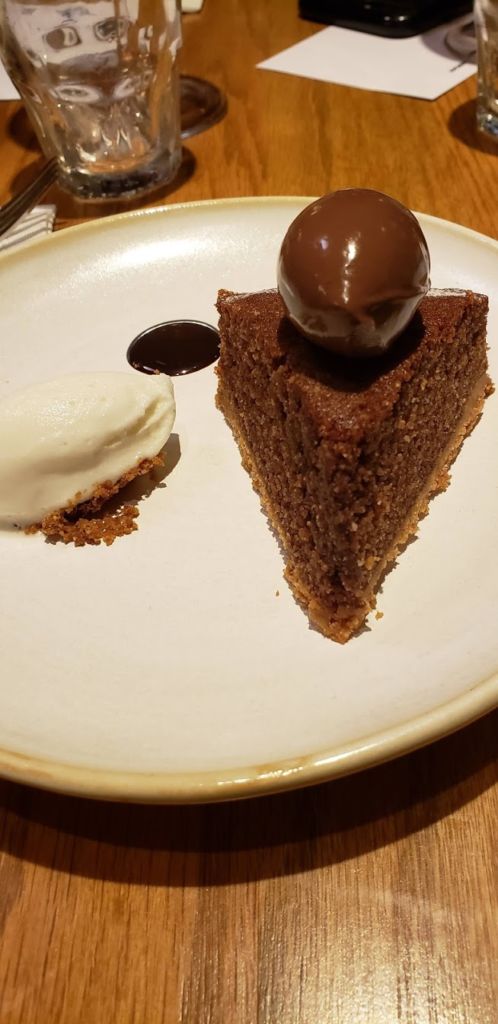 Obviamente, el postre es el momento estelar para presumir la especialidad de la casa. Esto se logra con una tarta de cacao y almendra, terminada con un mousse (¡perfecto!) y un helado de leche. Las palabras se quedan cortas para describir este postre maravilloso y lo mejor sería que lo descubras por ti mismo. Se maridó con un Brut d’Argent, un vino espumoso rosado de Pinot Noir proveniente del Valle de Loira en Francia.