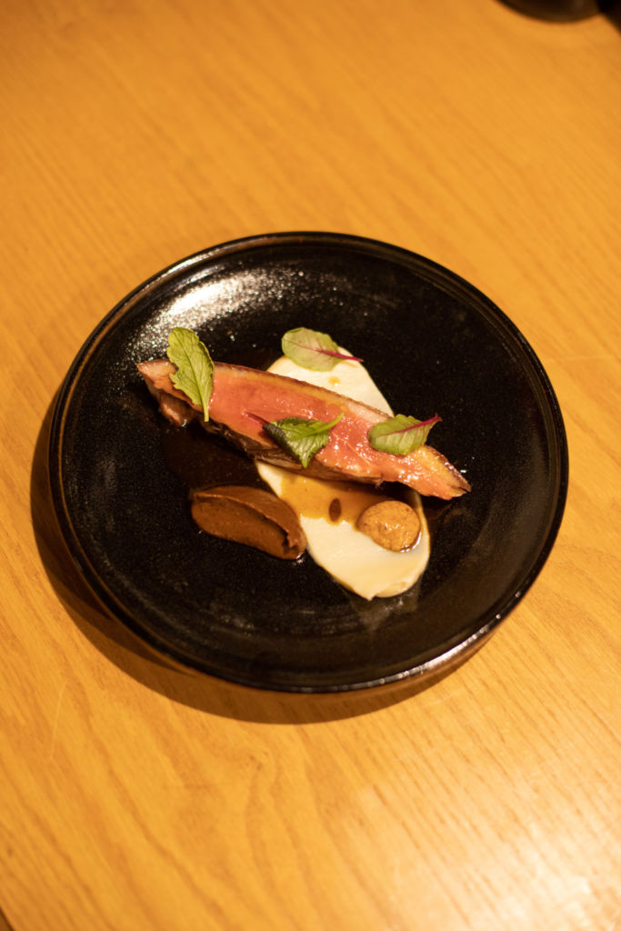 El plato fuerte fue un pato añejado con miel de cacao, puré de apionabo y mole de naranja con cacao. Este platillo llega a la cima de los sabores: tiene dulce, salado, ácido, amargo y umami; todo en balance. Junto con Relámpago, hacen que esta cena sea una experiencia culinaria de alta calidad.