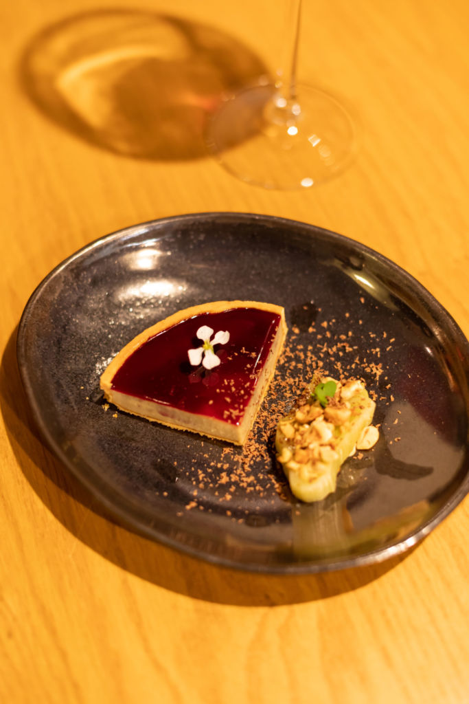 La cena, en la que el chocolate es el hilo conductor, se compone de cinco tiempos. Inicia con una delicada tarta de foie gras con jamaica y chocolate. Esta se acompaña de poro y avellana tostada. Las notas de chocolate son sutiles, a manera de introducción, pero la cremosidad de la tarta y el balance de sabores es excepcional. En la degustación se maridó con un vino dulce de Pago del Vicario, un merlot español de cosecha tardía que por su complejidad aromática crea la perfecta mancuerna.