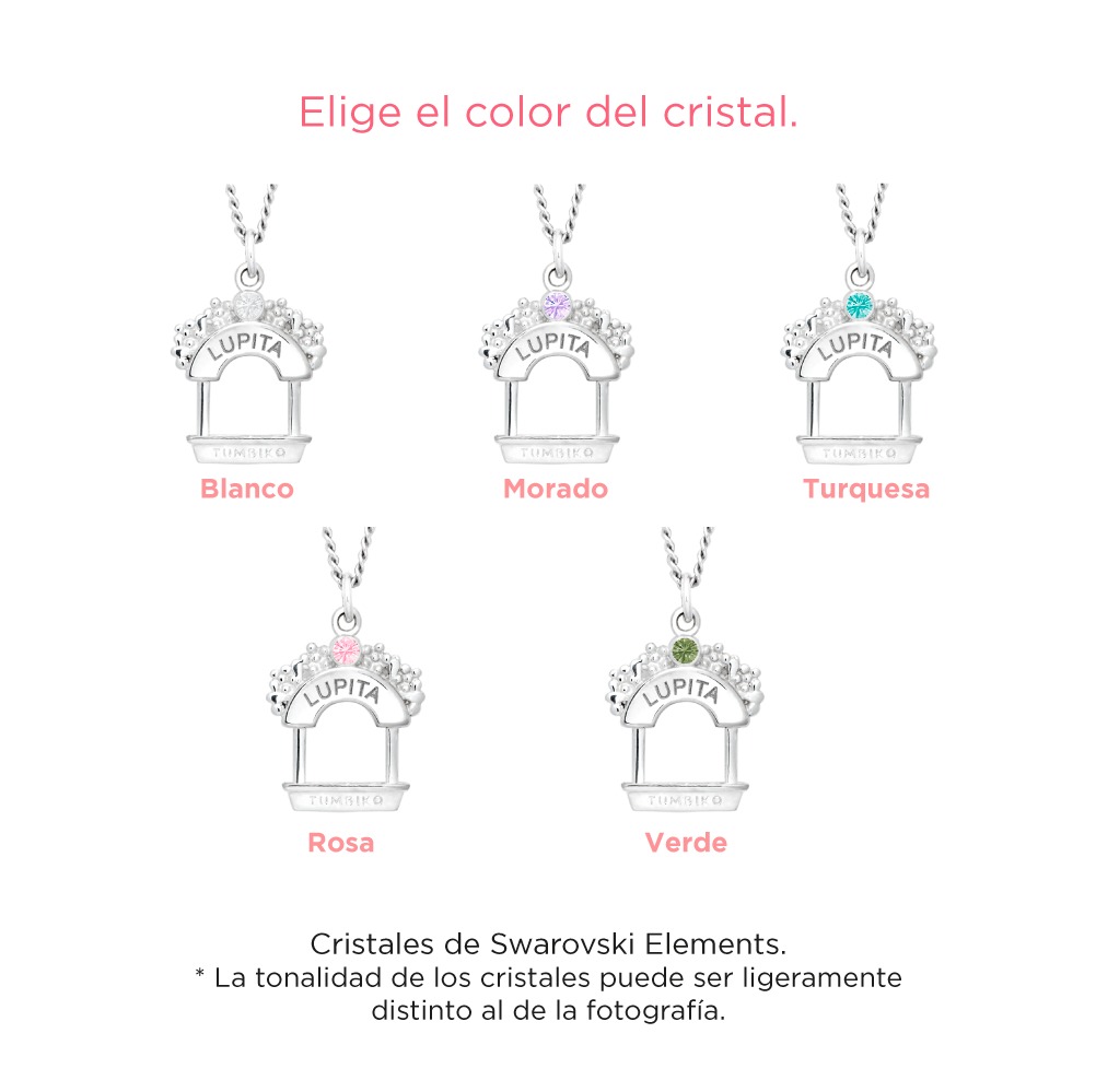 El collar Trajinera rescata la esencia que permite que la mujer mexicana se sienta orgullosa de su nombre y de su belleza. El dije está elaborado en plata.925, además de que incorpora un cristal “Swarovski Elements” en color turquesa, rosa, morado, blanco o verde.
