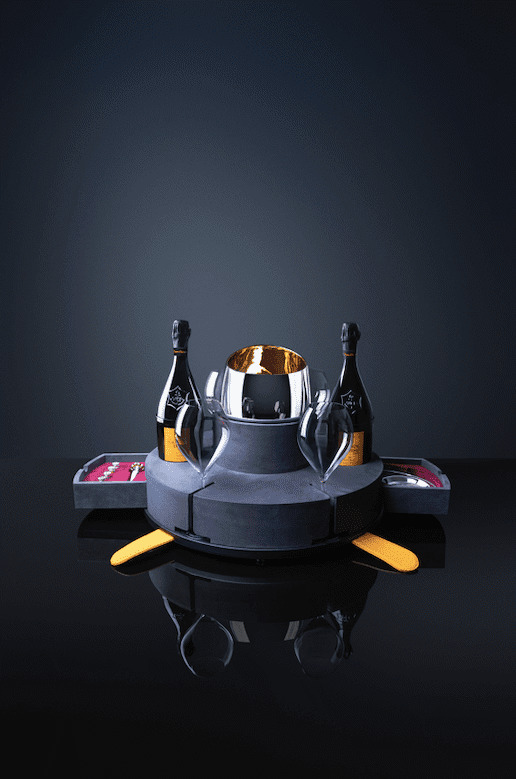 Veuve Clicquot y TANE crearon un baúl edición limitada inspirado en el altar de muertos, confeccionado a mano y forrado en cuero vegetal fabricado a partir de los cactus de nopal. Cada pieza de este baúl, representa la característica flor de cempasúchil. TANE parte de esta simbología para confeccionar una metáfora en plata .925 y vermeil en oro amarillo de 23 quilates. El kit incluye dos botellas de Veuve Clicquot, cuatro copas , cuatro identificadores de copa en oro y plata, un cubo para champagne y un tapón con flor de cempasúchil.  Sin duda, un altar digno de celebración con mucho estilo.