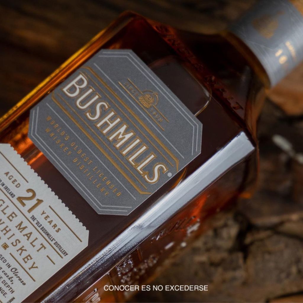 Finalmente, Bushmills 21 es un espectacular Single Malt que pasa 19 de sus 21 años de añejamiento en barricas de roble americano ex bourbon y roble europeo ex jerez; a diferencia de Bushmills 16, esta etiqueta pasa los últimos años en barricas de Madeira. El resultado es un un líquido que abre con notas suaves y dulces de maple, compota de fruta y madera, para luego pasar a notas más bien amargas como de chocolate, café y canela, que se fusionan con la textura cremosa y aterciopelada que hacen de esta botella el maridaje perfecto para la hora del postre.