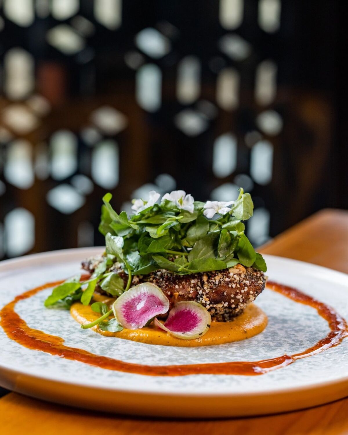 Así pues, el menú está diseñado alrededor de los ingredientes de temporada para crear platos con un concepto de cocina de campo repleta de guiños a la cocina tradicional oaxaqueña, pero también a la gastronomía internacional. Destacan, por ejemplo, el Sashimi Nikkei —atún sellado a la brasa, acompañado de pepinos europeos encurtidos y mango ahumado con leña de encino, bañado en salsa nam jin jaew típica de la cocina tailandesa—, la tostada tatemada —de calabazas con guacamole, nori tostado, verdolagas tiernas y quelites— y el Pavo Ahumado —glaseado con miel de agave y costra de almendras, acompañado de chichilo negro y puré de camote con duraznos asados—.