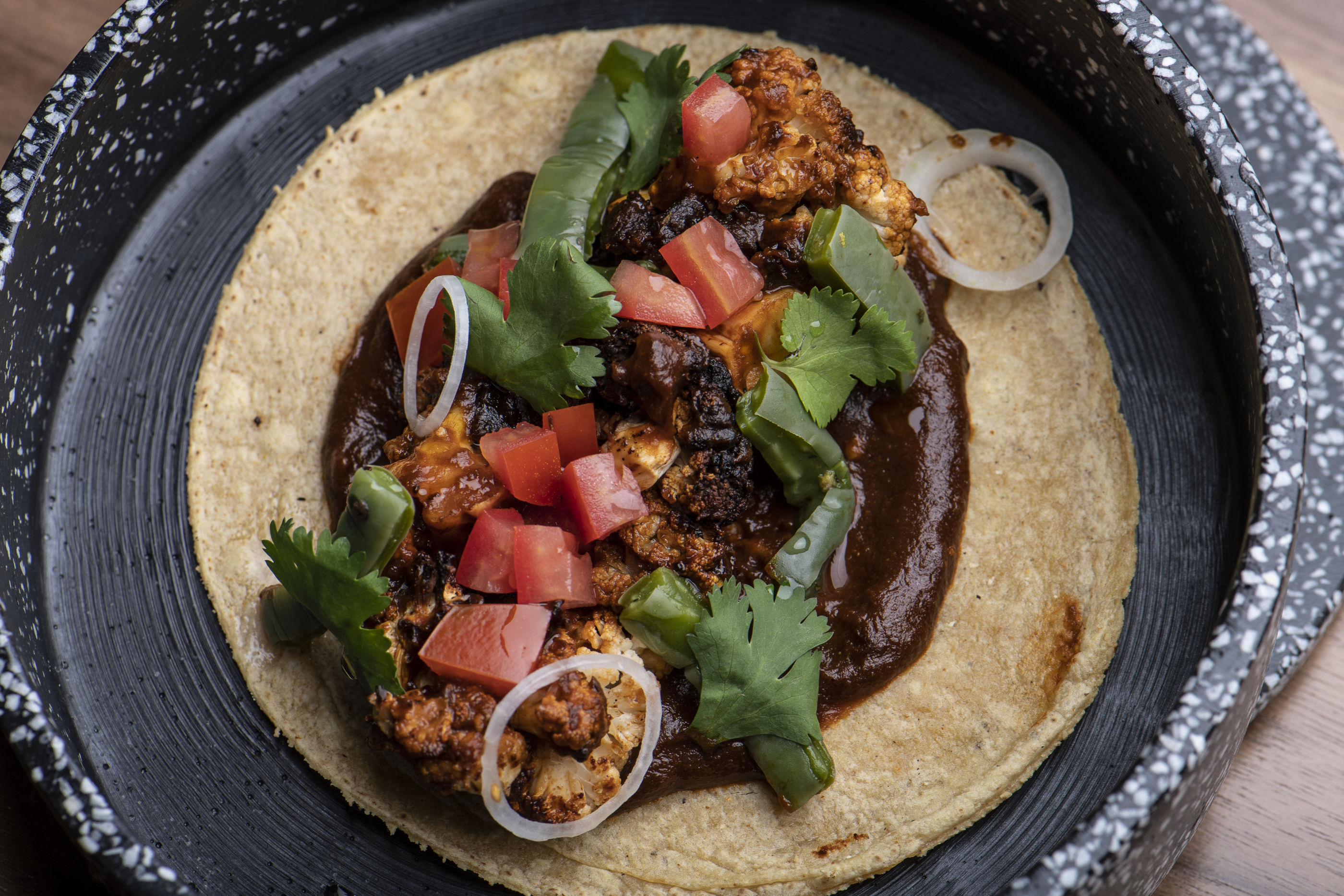 -De coliflor rostizada, nopales encurtidos y salsa de pasilla.