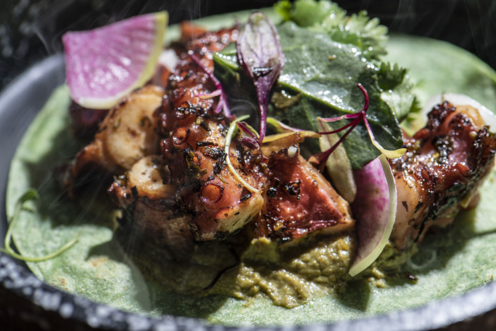 -De pulpo en gremolata con mole de quelites, ensalada de cilantro y pápalo.